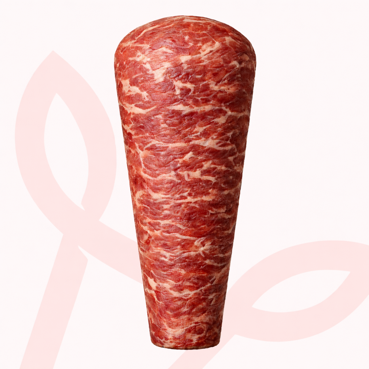 Döner Kebap ist ein Produkt, das den klassischen Döner-Rezept repräsentiert und aus 50 % Rinderlappenfleisch und 50 % Rinderhackfleisch hergestellt wird. Die faserige Struktur des Lappenfleisches verbindet sich mit der homogenen Textur des Hackfleischs und ergibt einen im Mund zergehenden, sättigenden Geschmack. Dieses Verhältnis spricht sowohl Fleischliebhaber als auch diejenigen an, die eine zarte Konsistenz bevorzugen.